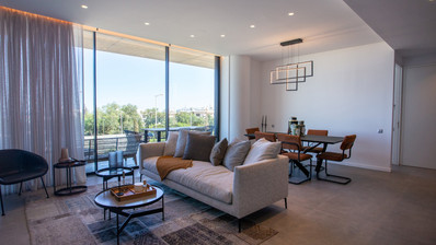 Situated on the first floor, the apartment features expansive glass facades that flood the open-plan interiors with natural light. A spacious 21.40 m² covered veranda extends your living space outdoors, offering beautiful views of the surrounding landscape and lush communal gardens.