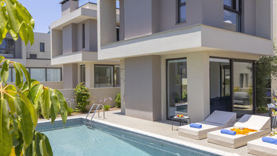 Beautiful modern 3-bedroom villa located just 300 metres from Malama Beach in Protaras. Built in 2021, the property features an open-plan design with natural wood and stone elements, large bedrooms, and floor-to-ceiling windows leading to a private garden and swimming pool.