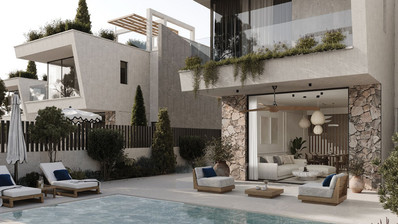 Designed to harmonise with its Mediterranean surroundings, the architecture blends clean contemporary lines with natural stone and refined Japandi-inspired interiors, creating a sophisticated yet understated aesthetic. Expansive floor-to-ceiling glazing floods the home with natural light and ensures a seamless flow between elegant indoor living spaces and beautifully landscaped outdoor areas.